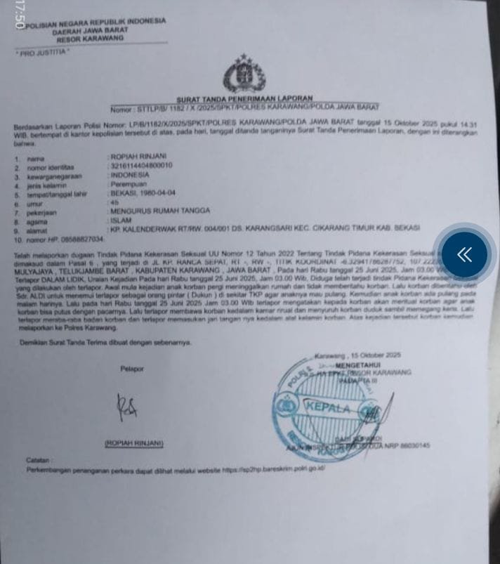 Tiga korban yang masih satu keluarga telah melaporkan pelaku ke Kepolisian Resor (Polres) Karawang berdasarkan Laporan Polisi Nomor LP/B/1182/X/2025/SPKT/POLRES KARAWANG/POLDA JAWA BARAT, tertanggal 15 Oktober 2025.