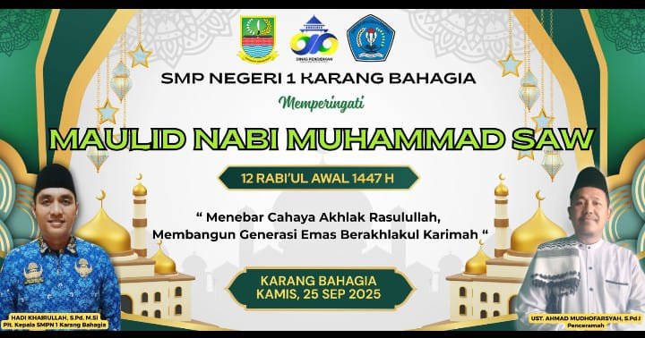KARANGBAHAGIA, KABUPATEN BEKASI || LINGKARAKTUAL.COM || – Peringatan Hari Besar Islam (PHBI) Hari Lahirnya Nabi Besar Muhammad SAW, Sekolah Menengah Atas Negri (SMPN 1) Karang Bahagia Kabupaten Bekasi mengangkat tema “MENEBAR CAHAYA AKHLAK RASULULLAH, MEMBANGUN GENERASI EMAS BERAKHLAKUL KARIMAH” Kamis (25-9-2025).