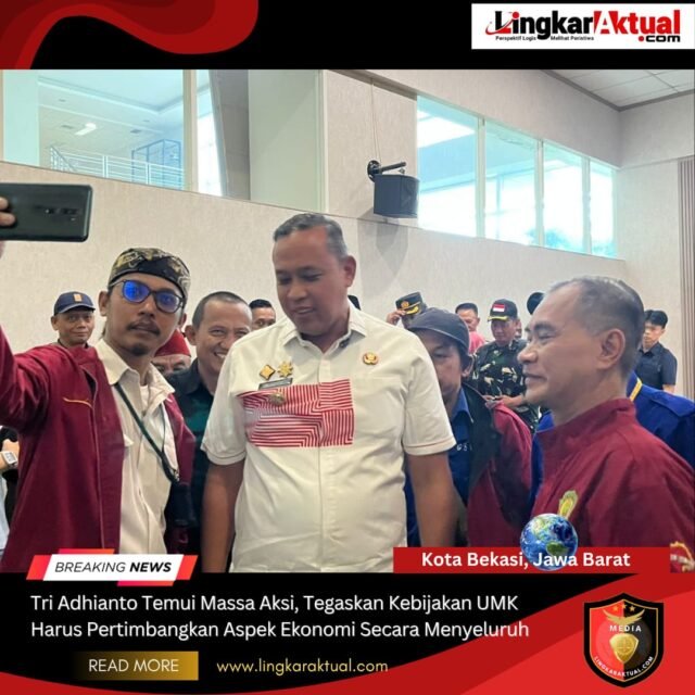KOTA BEKASI, JAWA BARAT || LINGKARAKTUAL.COM || – Wali Kota Bekasi Tri Adhianto turun langsung menemui massa aksi dari Aliansi Buruh Bekasi Melawan (BBM) yang menggelar demonstrasi di depan Gedung Pemerintah Kota Bekasi, Kamis (30/10/2025). Dalam aksi tersebut, ratusan buruh menuntut kejelasan terkait pembahasan Upah Minimum Kota/Kabupaten (UMK) Tahun 2026, sekaligus menyampaikan sejumlah aspirasi lainnya.